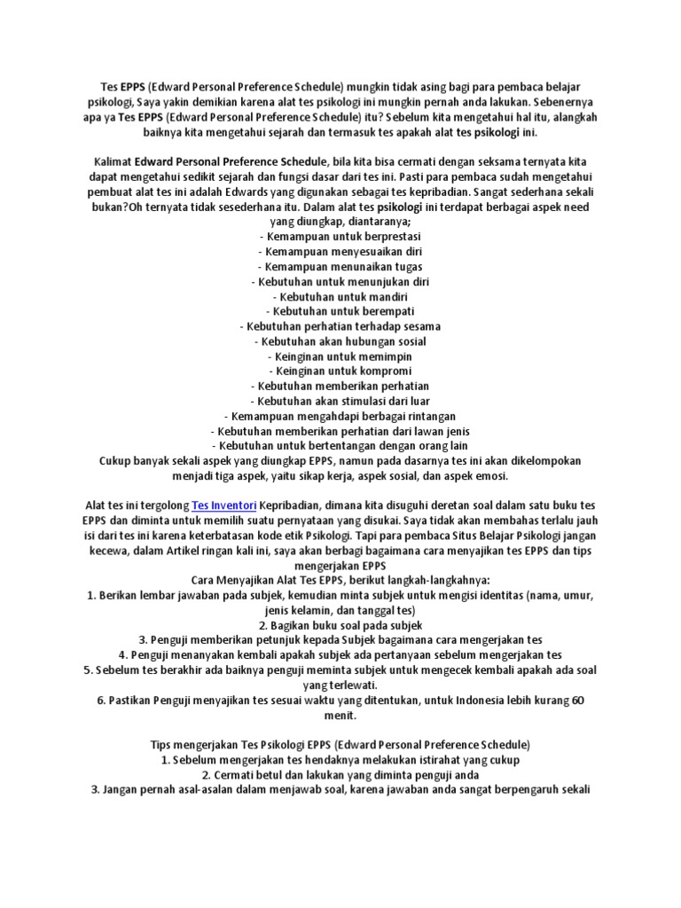 Jadi langkah langkah mengakali tes epps adalah. Skala validitas adalah 15 pasang pertanyaan yang memiliki bunyi yang sama. Biasanya soal epps ini berjumlah 100 anda harus menyelesaikannya dalam waktu 24 menit jawablah setiap pertanyaan yang mencerminkan posisi pekerjaan yang sedang anda lamar. A murray, yang mencakup 15 kebutuhan yang harus dimiliki manusia. Terdapat manual penggunaan alat tes dan contoh laporan hasil interpretasi tes epps 4.